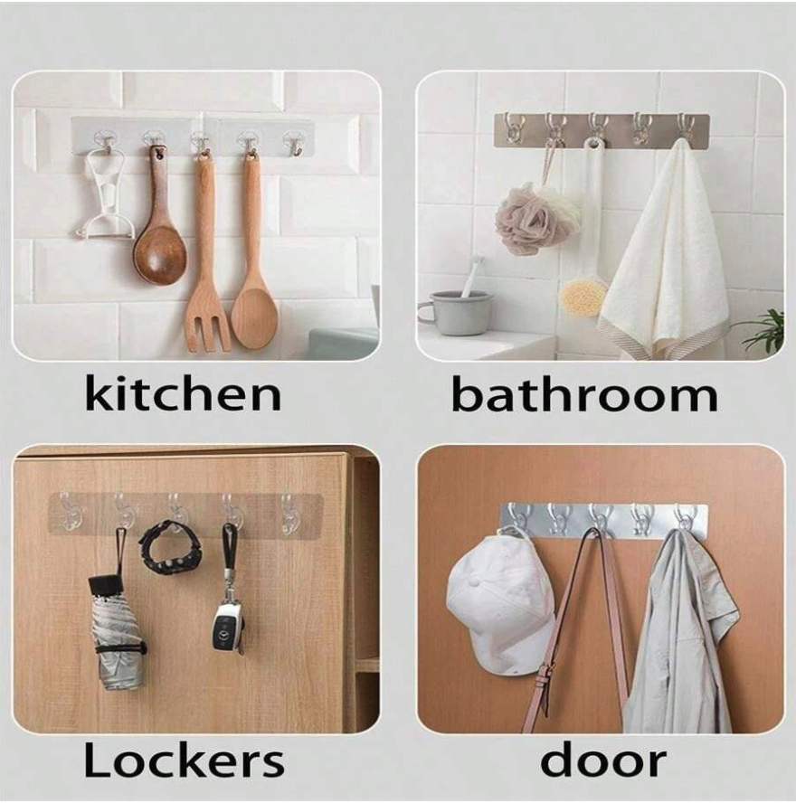 Organize your space effortlessly with our 6-in-1 Heavy-Duty Self-Adhesive Wall Hooks. Perfect for any room—living room, bathroom, bedroom, kitchen, or hallway—these transparent hooks securely hold jackets, scarves, wallets, umbrellas, towels, and more.